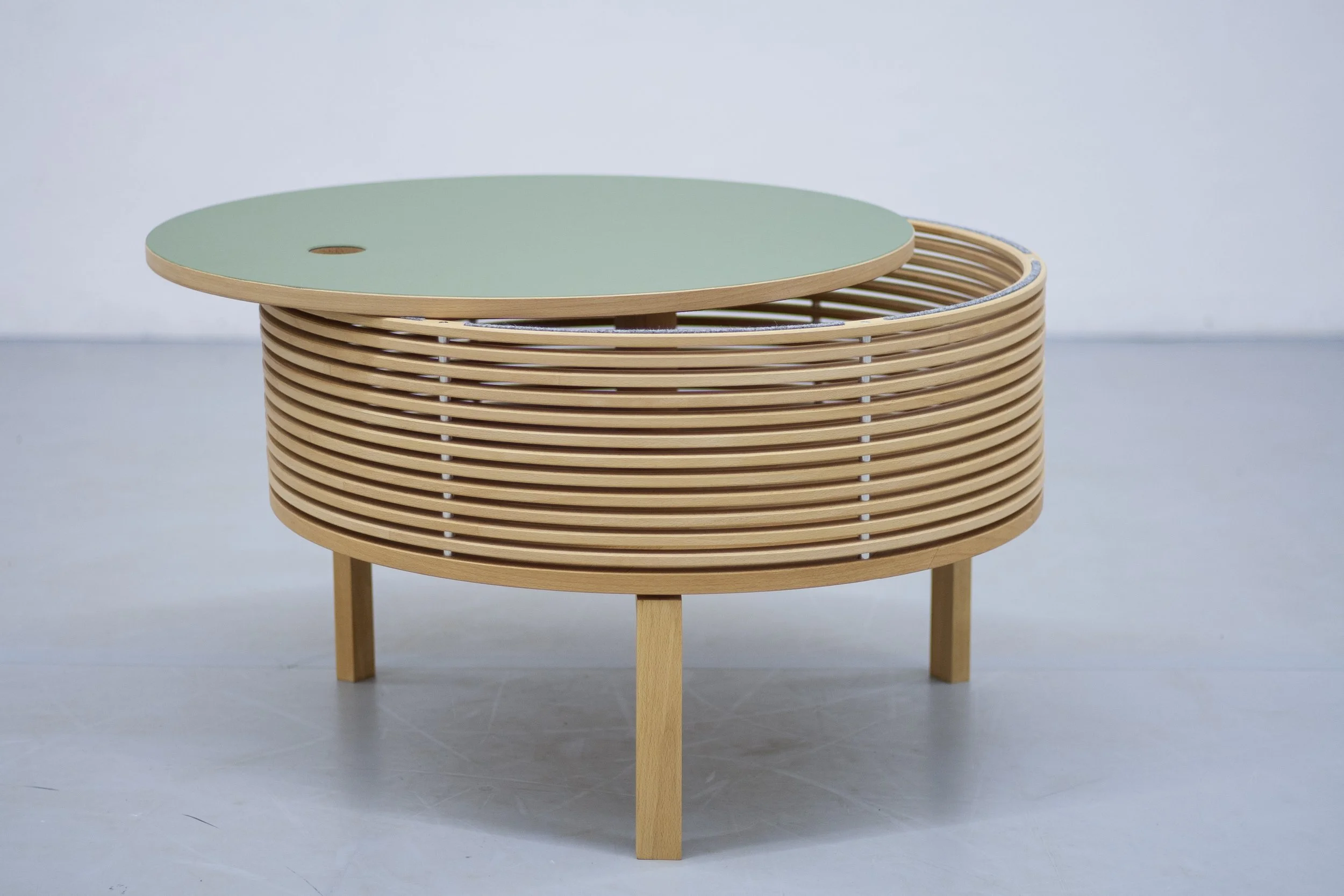 Gleichmäßig übereinander angeordnete Ringe aus Formholz bilden den Zylinderförmigen Körper des Tisches. Die mit olivgrünem Linoleum bezogene obere Platte lässt sich durch eine sanfte Bewegung zur Seite schieben um Zeitschriften, Bücher oder Dinge des täglichen Bedarfes im Inneren des Tisches zu verstauen. Zum Schließen gleitet die Platte über einen schmalen Filzstreifen zurück in Ihre Ausgangsposition. Für eine individuelle Gestaltung kann aus verschiedenen Dekoren und Größen gewählt werden.